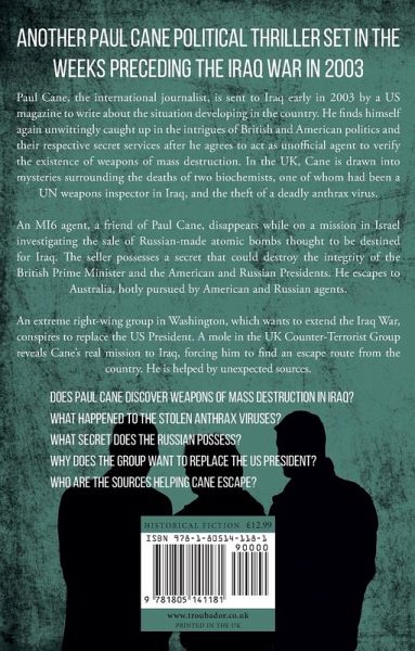 The international journalist, Paul Cane, is sent to Iraq early in 2003 by a US magazine to write about the situation developing in the country. He finds himself again unwittingly caught up in the intrigues of British and American politics and their respective secret services after he agrees to act as unofficial agent to verify the existence of weapons of mass destruction. In the UK, Cane is drawn into mysteries surrounding the deaths of two biochemists, one of whom had been a UN weapons inspector in Iraq, and the theft of a deadly anthrax virus from the Biochemical Warfare Defence Establishment at Porton Down. An MI6 agent disappears while on a mission in Israel investigating the sale of Russian-made atomic bombs thought to be destined for Iraq. The seller, who was close to the Russian President, possesses a secret that could destroy the integrity of the British Prime Minister and the presidents of America and Russia. He escapes to Australia hotly pursued by US and Russian agents. An extreme right-wing group in Washington who want to extend the Iraq War, conspire to replace the US President. A mole in the UK Counter-Terrorist Group reveals Cane's real mission to the Iraqis forcing him to find an escape route from the country. He is helped by unexpected sources. Does Paul Cane discover weapons of mass destruction in Iraq? What happened to the stolen anthrax viruses? What secret does the Russian possess? Why does the group want to replace the US President? Who are the sources helping Cane escape?