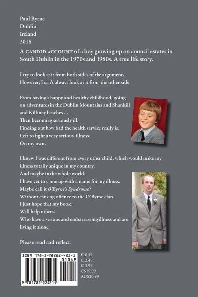 Paul Byrne Dublin Ireland 2015 A candid account of a boy growing up on council estates in South Dublin in the 1970s and 1980s. A true life story. I try to look at it from both sides of the argument. However, I can't always look at it from the other side. From having a happy and healthy childhood, going on adventures in the Dublin Mountains and Shankill and Killiney beaches ... Then becoming seriously ill. Finding out how bad the health service really is. Left to fight a very serious illness. On my own. I knew I was different from every other child, which would make my illness totally unique in my country. And maybe in the whole world. I have yet to come up with a name for my illness. Maybe call it O'Byrne's Syndrome? Without causing offence to the O'Byrne clan. I just hope that my book. Will help others. Who have a serious and embarrassing illness and are living it alone. Please read and reflect.