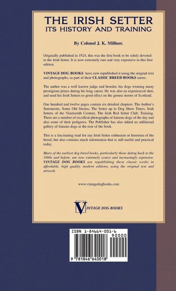THE IRISH SETTER ITS HISTORY AND TRAINING By Colonel J.K. Millner. A VINTAGE DOG BOOKS CLASSIC REPRINT Originally published in 1924, this was the first book to be solely devoted to the Irish Setter. It is now extremely rare and very expensive in this first edition. VINTAGE DOG BOOKS have now republished it using the original text and photographs, as part of their CLASSIC BREED BOOKS series. he author was a well known judge and breeder, his dogs winning many prestigious prizes during his long career. He was also an experienced shot, and used his Irish Setters to good effect on the grouse moors of Scotland. One hundred and twelve pages contain six detailed chapters: - The Author's Statements. - Some Old Strains. - The Setter up to Dog Show Times. - Irish Setters of the Nineteenth Century. - The Irish Red Setter Club. - Training. There are a number of excellent photographs of famous dogs of the day and also some of their pedigrees. The Publisher has also added an additional gallery of famous dogs at the rear of the book. This is a fascinating read for any Irish Setter enthusiast or historian of the breed, but also contains much information that is still useful and practical today. Many of the earliest dog breed books, particularly those dating back to the 1900s and before, are now extremely scarce and increasingly expensive. VINTAGE DOG BOOKS are republishing these classic works in affordable, high quality, modern editions, using the original text and artwork.