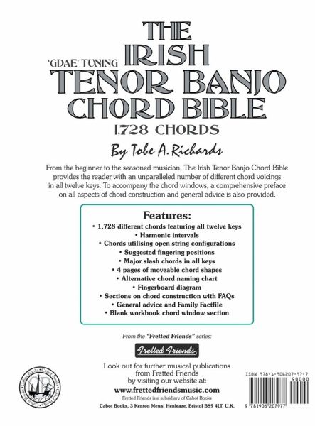 The Irish Tenor Banjo Chord Bible, with its 1,728 chords offers a complete solution for both beginner and experienced professional musician alike. The layout is uncomplicated and follows a logical musical progression from standard major chords up to the more esoteric thirteenths used by many jazz players. To accompany the 1,728 chords, a further 576 possible moveable chord configurations are included, together with a useful range of slash chords, reflecting the popularity of this type of chord in many of today's artist and compilation topline songbooks. This highly comprehensive guide provides the musician with no fewer than 68 different types of chord in all twelve keys, making it the definitive publication for the Irish tenor banjo. Whether you play folk, rock, pop, jazz or any other type of popular music, The Irish Tenor Banjo Chord Bible makes the ideal reference source for all occasions. Standard Chords covered in The Irish Tenor Banjo Chord Bible (using the key of C as an example): C, Cm, C7, Cm7, C5, C6, Cm6, Cmaj7, Cdim, Cdim7, C-5, C+, Csus2, Csus4, C7sus4, Cm7-5, Cadd9, Cmadd9, C6add9, Cm6add9, C7-5, C7+5, C7-9, C7+9, Cm(maj7), Cmaj7-5, Cmaj7+5, C9, Cm9, Cmaj9, C11, C13. Advanced Chords covered in The Irish Tenor Banjo Chord Bible (using the key of C as an example): C4, Cadd11, Csus4add9, Cm-6, C7sus2, C7-5-9, C7-5+9, C7+5-9, C7+5+9, C7add11, C7add13, C7+11, Cm7-5-9, Cm7-9, Cm7add11, Cmaj7+11, C9sus4, C9-5, C9+5, C9+11, Cm9-5, Cm(maj9), Cmaj9-5, Cmaj9+5, Cmaj9+11, Cmaj9add6, C11-9, Cm11, Cmaj11, C13sus4, C13-5-9, C13-9, C13+9, C13+11, Cm13, Cmaj13. Major Slash Chords covered in The Irish Tenor Banjo Chord Bible (using the key of C as an example): C/C, C/Db, C/D, C/Eb, C/E, C/F, C/F#, C/G, C/Ab, C/A, C/Bb, C/B. Beside the many pages of chord boxes or windows, the book features useful sections on tuning, chord construction, fingerboard layout, FAQs, alternative chord naming, fingering, slash chords, harmonic intervals, chord window blanks for transcribing your own favorite chord sequences etc. Review of features: 1,728 Chords featuring all 12 keys 144 Major slash chords in all keys 576 possible moveable chord positions Irish GDAE tuning Chord theory, FAQs and tuning guides Fingerboard diagrams Banjo family factfile Alternative chord naming chart Blank chord windows for your own jottings and arrangements The aim of this guide is to provide the musician with the flexibility only really offered to guitar and keyboard players in the past. Now, with the help of The Irish Tenor Banjo Chord Bible, musicians will be able to pick up any songbook and instantly have access to even the most complex and advanced chords. This popular guide is available for the first time in a brand new luxury 10th anniversary hardback edition.