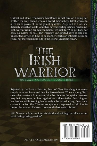 Amazon #1 Best Selling Historical Romance - The Norman Conquest Series The Irish Warrior - Book Three Outcast and alone, Thomasina MacDonell is hell bent on finding her brother, the only person who can thwart their father's latest scheme to offer her as payment for his gambling debts. Disguised as a lad, she defiantly sets off on foot to locate him never expecting to find a handsome, Irish warrior riding her beloved horse. Her first duty? To get back her horse no matter the cost. The warrior's unexpected offer of help and unsolicited advice on how to be manlier sparks an intimate desire to reveal her more feminine side to the strong, unyielding man. Rejected by the love of his life, Sean O'Cisoghe wants simply to return home and heal his broken heart. When a young "lad" steals the horse out from under him, he discerns the spirited woman may be in way over her head against her ruthless father. Searching for her brother while keeping her would-be betrothed at bay, Sean must confront the fact that Thomasina sparks a deep need within him to protect her as one of his own because she has stolen his heart. Will Norman soldiers out for his blood and shifting clan alliances cut short their growing passion?