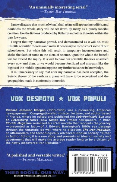Richard Jameson Morgan (1850-1906) was a pioneering American newspaperman, Congregationalist minister, lecturer, and author based in Florida, where he edited and published the Sub-Peninsula Sun and St. Petersburg Times (now Tampa Bay Times) newspapers. In 1902, Florida Magazine serialized his sci-fi novella that recounts the story - presented as fact - of J. Edward Barrington's 1890s sea passage through the Antarctic ice wall where he discovers The Iron Republic, an ultramodern and technologically advanced utopian society. "Either as fact or fiction, it is a rare story and presents an ideal of society and government that will make the average reader long to be a citizen of the newly discovered Iron Republic."