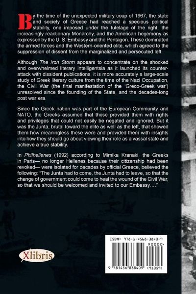 By the time of the unexpected military coup of 1967, the state and society of Greece had reached a specious political stability, one imposed under the tutelage of the right, the increasingly reactionary monarchy, and the American hegemony as expressed by the U.S. Embassy and the Pentagon. They dominated the armed forces and the Western-oriented elite, which agreed to the suppression of dissent from the marginalized and persecuted left. Although The Iron Strom appears to concentrate on the shocked and overwhelmed intelligentsia as it launched its counterattack with dissident publications, it is more accurately a large-scale study of Greek literary culture from the time of the Nazi Occupation, the Civil War (the final manifestation of the Greco-Greek War) unresolved since the founding of the state and the decades-long post war era. Since the Greek nation was part of the European community and NATO, the Greeks assumed that these provided them with rights and privileges that could not easily be negated and ignored. But it was the Junta, brutal toward the elite as well as the left, that showed them how meaningless these were and provided them with insights into how they should go about viewing their role as a vassal state and achieve a true stability.