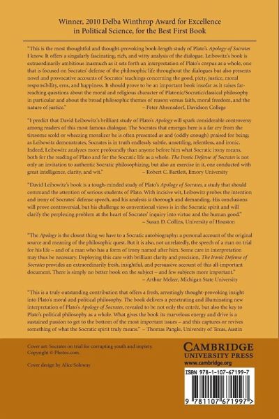 This book offers a controversial interpretation of Plato's Apology of Socrates. By paying unusually close attention to what Socrates indicates about the meaning and extent of his irony, David Leibowitz arrives at unconventional conclusions about Socrates' teaching on virtue, politics, and the gods; the significance of his famous turn from natural philosophy to political philosophy; and the purpose of his insolent 'defense speech'. Leibowitz shows that Socrates is not just a colorful and quirky figure from the distant past but an unrivaled guide to the good life - the thoughtful life - who is as relevant today as in ancient Athens. On the basis of his unconventional understanding of the dialogue as a whole, and of the Delphic oracle story in particular, Leibowitz shows that the Apology is the key to the Platonic corpus, indicating how many of the disparate themes and apparently contradictory conclusions of the other dialogues fit together.