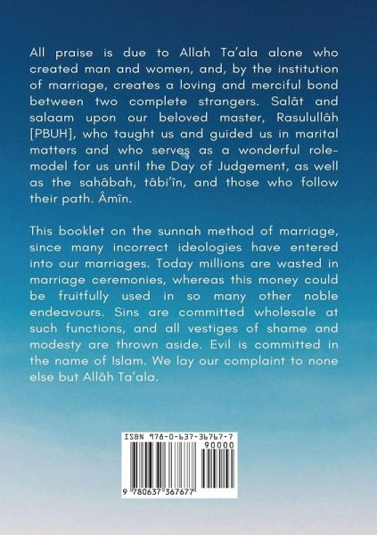 All praise is due to Allah Ta'ala alone who created man and women, and, by the institution of marriage, creates a loving and merciful bond between two complete strangers. Salât and salaam upon our beloved master, Rasulullâh [PBUH], who taught us and guided us in marital matters and who serves as a wonderful role-model for us until the Day of Judgement, as well as the sahâbah, tâbi'în, and those who follow their path. Âmîn. This booklet on the sunnah method of marriage, since many incorrect ideologies have entered into our marriages. Today millions are wasted in marriage ceremonies, whereas this money could be fruitfully used in so many other noble endeavours. Sins are committed wholesale at such functions, and all vestiges of shame and modesty are thrown aside. Evil is committed in the name of Islam. We lay our complaint to none else but Allâh Ta'ala. This book is cover following topic, INTRODUCTION SIMPLICITY IMPORTANCE OF MARRIAGE BENEFITS OF MARRIAGE HARMS OF NOT MARRYING RULING OF MARRIAGE HASTENING OF MARRIAGE BASIS FOR CHOOSING A PARTNER VIEWING THE PROSPECTIVE BRIDE SIMPLICITY IN NIKÂH - EXEMPLARY MARRIAGES SUMMARY THE WALÎMAH CUSTOMS CHRISTIAN CUSTOMS: HINDU CUSTOMS WESTERN, MODERN CUSTOMS OTHER EVILS ACTIONS AFTER MARRIAGE PROHIBITTED ACTIONS ETIQUETTES OF SPOUSES ETIQUETTES FOR HUSBANDS ETIQUETTES FOR WIVES CONCLUSION BIBLIOGRAPHY