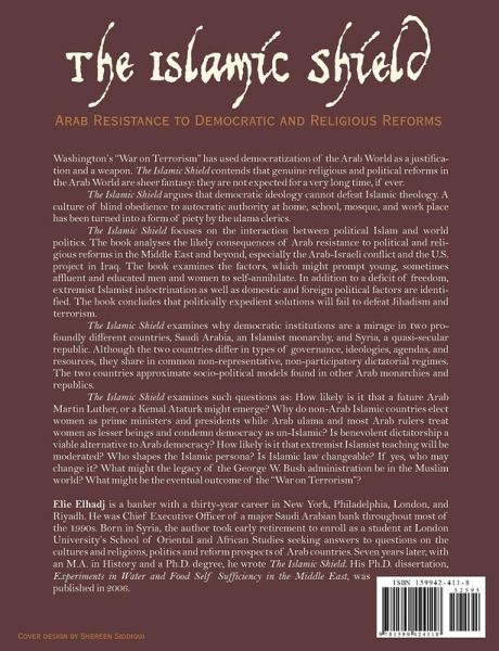 America's War on Terrorism uses democratization of the Arab World as a main weapon. The Islamic Shield argues that democratization of Arab countries is a fantasy because democratic elections today would lead to replacing the dictatorships of Arab rulers by Islamist theocratic dictatorships. The book contends that the Arab peoples are generally characterized by a culture of obedience to hierarchical authority in the home, school, mosque, the work place, and the country at large. The book identifies religious and cultural causes, as well as domestic and foreign political factors that set off Jihadists' terrorism. The book recommends solutions, stressing that political expediencies will not end terrorism. The Islamic Shield examines why two different countries; Saudi Arabia, an Islamist monarchy; and Syria, a quasi-secular republic, share in common non-representative non-participatory dictatorships mired in cronyism and corruption. The examination concludes that genuine reforms are not likely soon. The two countries can be prototypes of other Arab countries. The Islamic Shield considers: why do non-Arab Islamic countries elect women as prime ministers while Arab rulers and Ulama (Muslim clergy) condemn democracy as un-Islamic and treat women as lesser beings? Should benevolent dictatorship replace Arab democracy as an objective? Who shapes the Islamic persona? Is Islamic Law changeable? If yes, who may change it? How likely that an Arab Martin Luther, or Kemal Ataturk might emerge? What might be causing the growing attachment of Arabs today to radical Islam? Did politicizing Genesis 15:18 politicize the Quran? How sustainable is a two-state solution to the Palestinian-Israeli conflict? What might the effect of a Shii crescent of influence be on stirring bloody conflicts between Shiis and Sunnis? What might the legacy of the George W. Bush Administration be in the Muslim world? What might be the outcome of the War on Terrorism?
