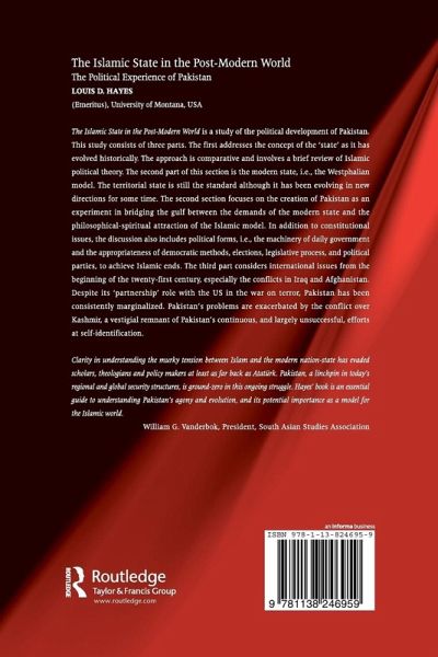The Islamic State in the Post-Modern World is a study of the political development of Pakistan. This study consists of three parts. The first addresses the concept of the 'state' as it has evolved historically. The approach is comparative and involves a brief review of Islamic political theory. The second part of this section is the modern state, i.e., the Westphalian model. The territorial state is still the standard although it has been evolving in new directions for some time. The second section focuses on the creation of Pakistan as an experiment in bridging the gulf between the demands of the modern state and the philosophical-spiritual attraction of the Islamic model. In addition to constitutional issues, the discussion also includes political forms, i.e., the machinery of daily government and the appropriateness of democratic methods, elections, legislative process, and political parties, to achieve Islamic ends. The third part considers international issues from the beginning of the twenty-first century especially the conflicts in Iraq and Afghanistan. Despite its 'partnership' role with the US in the war on terror, Pakistan has been consistently marginalized. Pakistan's problems are exacerbated by the conflict over Kashmir, a vestigial remnant of Pakistan's continuous, and largely unsuccessful, efforts at self-identification.