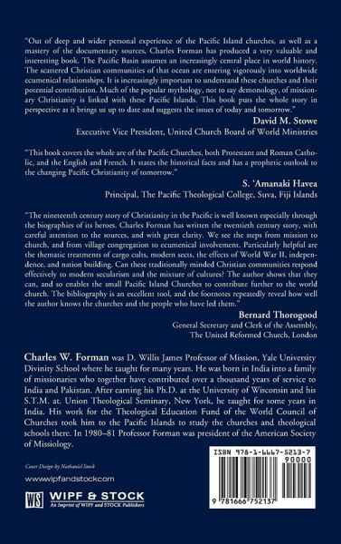 "Out of deep and wider personal experience of the Pacific Island churches, as well as a mastery of the documentary sources, Charles Forman has produced a very valuable and interesting book. The Pacific Basin assumes an increasingly central place in world history. The scattered Christian communities of that ocean are entering vigorously into worldwide ecumenical relationships. It is increasingly important to understand these churches and their potential contribution. Much of the popular mythology, not to say demonology, of missionary Christianity is linked with these Pacific Islands. This book puts the whole story in perspective as it brings us up to date and suggests the issues of today and tomorrow." David M. Stowe, Executive Vice President, United Church Board of World Ministries "This book covers the whole are of the Pacific Churches, both Protestant and Roman Catholic, and the English and French. It states the historical facts and has a prophetic outlook to the changing Pacific Christianity of tomorrow." S. 'Amanaki Havea, Principal, The Pacific Theological College, Suva, Fiji Islands "The nineteenth century story of Christianity in the Pacific is well known especially through the biographies of its heroes. Charles Forman has written the twentieth century story, with careful attention to the sources, and with great clarity. We see the steps from mission to church, and from village congregation to ecumenical involvement. Particularly helpful are the thematic treatments of cargo cults, modern sects, the effects of World War II, independence, and nation building. Can these traditionally minded Christian communities respond effectively to modern secularism and the mixture of cultures? The author shows that they can, and so enables the small Pacific Island Churches to contribute further to the world church. The bibliography is an excellent tool, and the footnotes repeatedly reveal how well the author knows the churches and the people who have led them." Bernard Thorogood, General Secretary and Clerk of the Assembly, The United Reformed Church, London