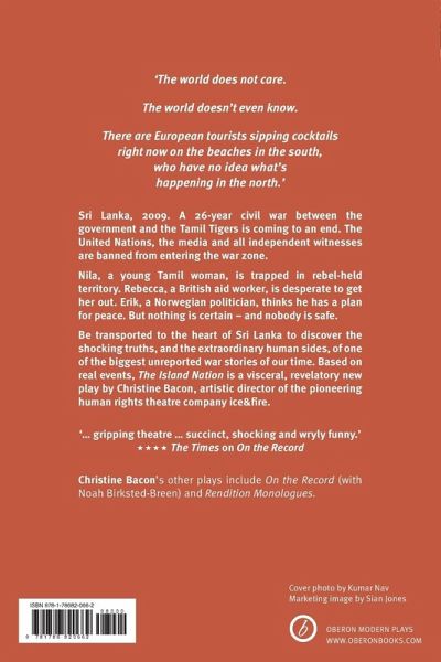 The world does not care. The world doesn't even know. There are European tourists sipping cocktails right now on the beaches in the south, who have no idea what's happening in the north. Sri Lanka, 2009. A 26-year civil war between the government and the Tamil Tigers is coming to an end. The United Nations, the media and all independent witnesses are banned from entering the war zone. Nila, a young Tamil woman, is trapped in rebel-held territory. Rebecca, a British aid worker, is desperate to get her out. Erik, a Norwegian politician, thinks he has a plan for peace. But nothing is certain - and nobody is safe. Be transported to the heart of Sri Lanka to discover the shocking truths, and the extraordinary human sides, of the biggest unreported war story of our time. Based on real events, The Island Nation is a visceral, revelatory new play by Christine Bacon, artistic director of the pioneering human rights theatre company ice&fire.