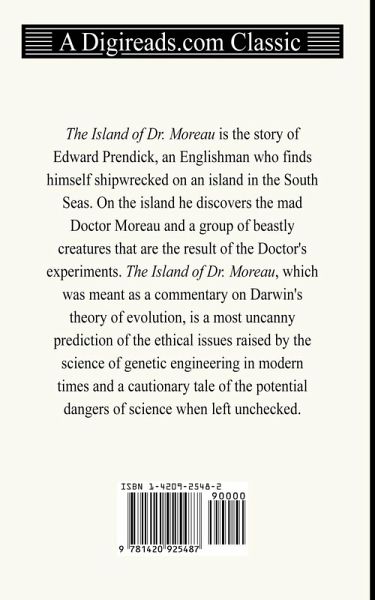 "The Island of Dr. Moreau" is the story of Edward Prendick, an Englishman who finds himself shipwrecked on an island in the South Seas. On the island he discovers the mad Doctor Moreau and a group of beastly creatures that are the result of the Doctor's experiments. "The Island of Dr. Moreau", which was meant as a commentary on Darwin's theory of evolution, is a most uncanny prediction of the ethical issues raised by the science of genetic engineering in modern times and a cautionary tale of the potential dangers of science when left unchecked.
