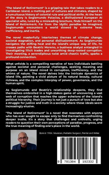 "The Island of Retirement" is a gripping tale that takes readers to a Caribbean Island, a melting pot of cultures and climates, shaped by a tumultuous history of colonial rule and political strife. At the heart of the story is Segismundo Palacios, a disillusioned European AI specialist who, lured by a misleading brochure, finds himself on the Island of Retirement. Far from the idyllic paradise he imagined, Segismundo encounters a world slowed by extreme heat, inefficiency, and inertia. The novel masterfully intertwines themes of climate change, societal stagnation, and personal disillusionment. As Segismundo navigates the stifling heat and the island's unique way of life, he crosses paths with Beatriz Moreno, a business analyst entangled in investigating illicit trades and unearthing deep-rooted corruption. Their meeting, a serendipitous twist amid chaotic traffic, sparks a profound connection. What unfolds is a compelling narrative of two individuals battling against societal and personal challenges, seeking meaning and purpose on an island mired in corruption, inefficiency, and the whims of nature. The novel delves into the intricate dynamics of island life, painting a vivid picture of its natural beauty, cultural richness, and the complex interplay of power, governance, and the human spirit. As Segismundo and Beatriz's relationship deepens, they find themselves embroiled in a high-stakes game of uncovering a vast web of corruption that reaches the upper echelons of the island's political hierarchy. Their journey is not just a pursuit of love but also a struggle for justice and truth in a society where these ideals seem increasingly elusive. "The Island of Retirement" is a novel that resonates with anyone who has ever sought to escape only to find themselves confronting deeper truths. It's a story that challenges and enthralls, urging readers to question their own perceptions of paradise, progress, and the true meaning of finding one's place in the world.