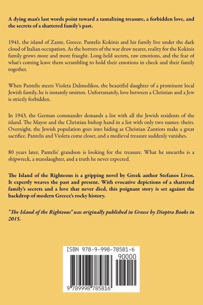 A dying man's last words point toward a tantalizing treasure, a forbidden love, and the secrets of a shattered family's past. 1941, the island of Zante, Greece. Pantelis Kokinis and his family live under the dark cloud of Italian occupation. As the horrors of the war draw nearer, reality for the Kokinis family grows more and more fraught. Long-held secrets, raw emotions, and the fear of what's coming leave them scrambling to hold their emotions in check and their family together. When Pantelis meets Violeta Dalmedikos, the beautiful daughter of a prominent local Jewish family, he is instantly smitten. Unfortunately, love between a Christian and a Jew is strictly forbidden. In 1943, the German commander demands a list with all the Jewish residents of the island. The Mayor and the Christian bishop hand in a list with only two names: theirs. Overnight, the Jewish population goes into hiding as Christian Zantiots make a great sacrifice. Pantelis and Violeta come closer, and a medieval treasure suddenly vanishes. 80 years later, Pantelis' grandson is looking for the treasure. What he unearths is a shipwreck, a manslaughter, and a truth he never expected. The Island of the Righteous is a gripping novel by Greek author Stefanos Livos. It expertly weaves the past and present. With evocative depictions of a shattered family's secrets and a love that never died, this poignant story is set against the backdrop of modern Greece's rocky history. "The Island of the Righteous" was originally published in Greece by Dioptra Books in 2015.