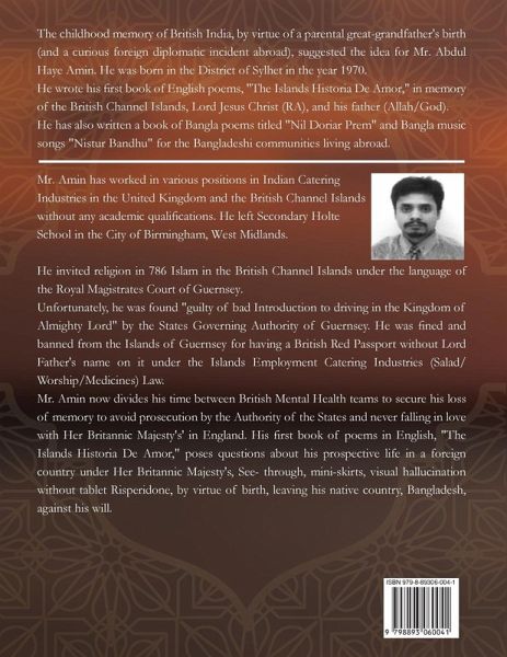 The childhood memory of British India, by virtue of a parental great-grandfather's birth (and a curious foreign diplomatic incident abroad), suggested the idea for Mr. Abdul Haye Amin. He was born in the District of Sylhet in the year 1970. He wrote his first book of English poems, "The Islands Historia De Amor," in memory of the British Channel Islands, Lord Jesus Christ (RA), and his father (Allah/God). He has also written a book of Bangla poems titled "Nil Doriar Prem" and Bangla music songs "Nistur Bandhu" for the Bangladeshi communities living abroad.