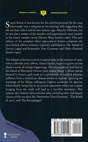 Simon Raven is best known for his colorful personal life (he once infamously sent a telegram to his starving wife suggesting that she eat their baby) and his ten-volume saga Alms for Oblivion, but he was also a master of the macabre and supernatural, most notably in his classic vampire novel Doctors Wear Scarlet (1960). This new edition of his complete short supernatural fiction comprises the two limited edition volumes originally published as The Islands of Sorrow (1994) and Remember Your Grammar and Other Haunted Stories (1997). The Islands of Sorrow is set in occupied Italy in the summer of 1945, where a British army officer, Adam Ogilvie, begins to grow curious about a series of strange happenings. His investigations lead him to the island of Marciume (whose name means "decay"), where nurses dressed in bizarre garb tend to a community of masked patients, sufferers from a mysterious disease similar to leprosy. Ignoring the warnings of his Italian colleagues, Ogilvie continues his queries, which finally bring him to an ancient catacombs where ten corpses hanging from the walls will lead to a horrible revelation. This volume also features eleven shorter tales, including eerie and elegant classics of the macabre like "Remember Your Grammar," "The Bottle of 1912," and "The Sarcophagus."