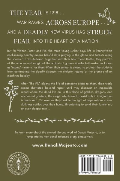 Journey to an island where the magic is real, hope is reborn, and the dead live on ... The year is 1918. War rages across Europe. A strange and deadly new disease has struck fear into the heart of a nation. But for Walter, Peter, and Pip, the three young Luther boys, life in Pennsylvania coal-mining country means blissful days playing in the glade and forests along the shores of Lake Acheron. Together with their best friend Hattie, they partake of the wonder and magic of the whimsical games Rosalie Luther-better known as "Mama"-invents for them. When the schools are closed to protect the students from contracting the deadly virus, the children rejoice at the promise of an indefinite holiday. After "The Flu" claims the life of someone close to them, their world seems shattered beyond repair-until they discover an impossible island where the dead live on. In this place of goblins, dragons, and enchanted gardens, the magic which used to exist only in imagination is made real. Yet even as they bask in the light of hope reborn, a new darkness settles over their home, threatening to send their family into an even deeper ruin ...