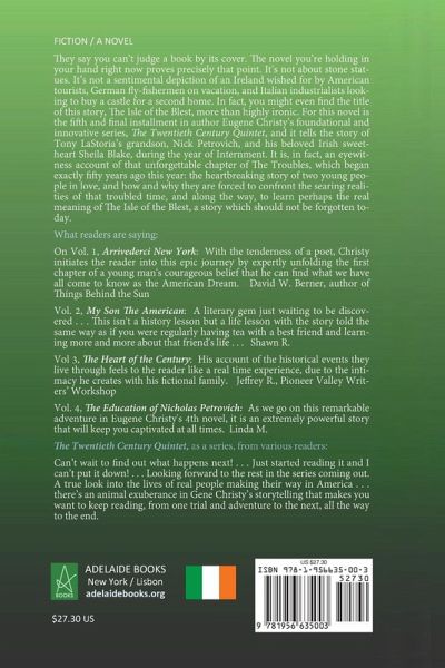 They say you can't judge a book by its cover. The novel you're holding in your hand right now proves precisely that point. It's not about stone statues. It's not a sentimental depiction of an Ireland wished for by American tourists, German fly-fishermen on vacation, and Italian industrialists looking to buy a castle for a second home. In fact, you might even find the title of this story, The Isle of the Blest, more than highly ironic. For this novel is the fifth and final installment in author Eugene Christy's foundational and innovative series, The Twentieth Century Quintet, and it tells the story of Tony LaStoria's grandson, Nick Petrovich, and his beloved Irish sweetheart Sheila Blake, during the year of Internment. It is, in fact, an eyewitness account of that unforgettable chapter of The Troubles, which began exactly fifty years ago this year: the heartbreaking story of two young people in love, and how and why they are forced to confront the searing realities of that troubled time, and along the way, to learn perhaps the real meaning of The Isle of the Blest, a story which should not be forgotten today. What readers are saying: On Vol. 1, Arrivederci New York: With the tenderness of a poet, Christy initiates the reader into this epic journey by expertly unfolding the first chapter of a young man's courageous belief that he can find what we have all come to know as the American Dream. David W. Berner, author of Things Behind the Sun Vol. 2, My Son The American: A literary gem just waiting to be discovered . . . This isn't a history lesson but a life lesson with the story told the same way as if you were regularly having tea with a best friend and learning more and more about that friend's life . . . Shawn R. Vol 3, The Heart of the Century: His account of the historical events they live through feels to the reader like a real time experience, due to the intimacy he creates with his fictional family. Jeffrey R., Pioneer Valley Writers' Workshop Vol. 4, The Education of Nicholas Petrovich: As we go on this remarkable adventure in Eugene Christy's 4th novel, it is an extremely powerful story that will keep you captivated at all times. Linda M. The Twentieth Century Quintet, as a series, from various readers: / Can't wait to find out what happens next! . . . Just started reading it and I can't put it down! . . . Looking forward to the rest in the series coming out. A true look into the lives of real people making their way in America . . . there's an animal exuberance in Gene Christy's storytelling that makes you want to keep reading, from one trial and adventure to the next, all the way to the end.