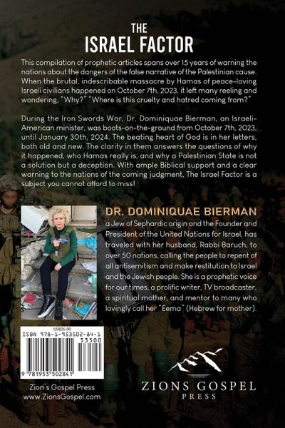 This compilation of prophetic articles spans over 15 years of warning the nations about the dangers of the false narrative of the Palestinian cause. When the brutal, indescribable massacre by Hamas of peace-loving Israeli civilians happened on October 7th, 2023, it left many reeling and wondering, "Why?" "Where is this cruelty and hatred coming from?" During the Iron Swords War, Dr. Dominiquae Bierman, an Israeli American minister, was boots-on-the-ground from October 7th, 2023, until January 30th, 2024. The beating heart of God is in her letters, both old and new. The clarity in them answers the questions of why it happened, who Hamas really is, and why a Palestinian State is not a solution but a deception. With ample Biblical support and a clear warning to the nations of the coming judgement. The Israel Factor is a subject you cannot afford to miss!