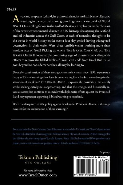 A volcano erupts in Iceland, its primordial smoke and ash blanket Europe, resulting in the worst air travel grounding since the ourbreak of World War II. On an oil rig far out in the Gulf of Mexico, an explosion marks the start of the worst environmental disaster in U.S. history, devastating the seafood and oil industries across the Gulf Coast. A rash of tornados, thought to be the worst in world history, strike over a four-day period leaving widespread destruction in their wake. Were these terrible events nothing more than random acts of God? Picking up where The Israel Omen left off, The Israel Omen II looks at the continuing sage of disasters coinciding with efforts to remove the fabled "Promised Land" from Israel. But it also goes beyond to consider what they all may be leading to. Does the continuation of these strange, even eerie events since 1991, represent a litany of Divine warnings that have been repeating like a broken record to gain the attention of mankind?