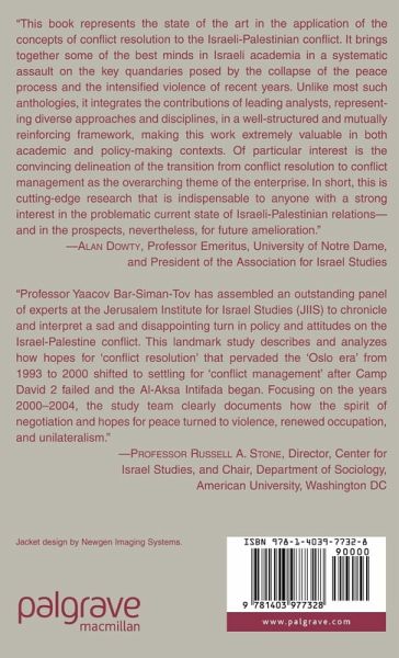 - Alan Dowty, Professor Emeritus, University of Notre Dame, and President of the Association for Israel Studies'Professor Yaacov Bar-Siman-Tov has assembled an outstanding panel of experts at the Jerusalem Institute for Israel Studies (JIIS) to chronicle and interpret a sad and disappointing turn in policy and attitudes on the Israel-Palestinian conflict. This landmark study describes and analyzes how hopes for 'conflict resolution' that pervaded the 'Oslo era' from 1993 to 2000 shifted tosettling for 'conflict management' after Camp David 2 failed and the Al-Aksa Intifada began. Focusing on the years 2000-2004, the study team clearly documents how the spirit of negotiation and hopes for peace turned to violence, renewed occupation, and unilateralism.'