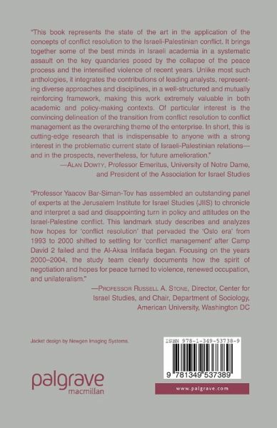 - Alan Dowty, Professor Emeritus, University of Notre Dame, and President of the Association for Israel Studies'Professor Yaacov Bar-Siman-Tov has assembled an outstanding panel of experts at the Jerusalem Institute for Israel Studies (JIIS) to chronicle and interpret a sad and disappointing turn in policy and attitudes on the Israel-Palestinian conflict. This landmark study describes and analyzes how hopes for 'conflict resolution' that pervaded the 'Oslo era' from 1993 to 2000 shifted tosettling for 'conflict management' after Camp David 2 failed and the Al-Aksa Intifada began. Focusing on the years 2000-2004, the study team clearly documents how the spirit of negotiation and hopes for peace turned to violence, renewed occupation, and unilateralism.'