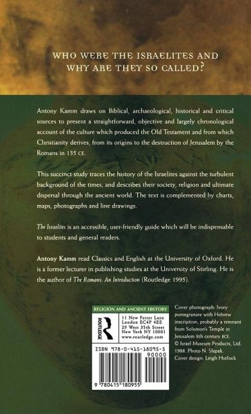 "The Israelites" is a concise yet comprehensive introduction to the people of the kingdoms of Israel and Judah up to the razing and renaming of Jerusalem and the virtual destruction of Palestine by Hadrian in A.D. 135. Drawing on Biblical, archaeological, historical and critical sources, Antony Kamm traces the history of the Israelites against the turbulent background of the times, and describes their society, religion and ultimate dispersal through the ancient world. The text is complemented by charts, maps, photographs and line drawings, and appendices provide a chronology, weights and measures, and the Jewish Calendar. Accessible and user-friendly, "The Israelites" will be indispensable for students and general readers as a starting point for the history, culture, and development of the people of Israel.
