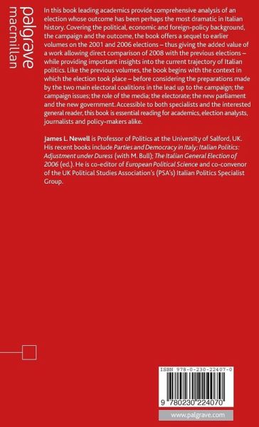Introduction: A Guide to the Election and 'Instructions for Use'; J.L.Newell PART I: THE CONTEXT The Political Context 2006 - 2008; A.Mastropaolo The Economic Context; M.Capriati The EU and International Contexts; G.A.Fois PART II: THE RUN-UP TO THE ELECTION The Parties of the Centre Left; I.Favretto The Parties of the Centre Right: Many Oppositions, One Leader; D.Albertazzi & D.McDonnell The Processes of Alliance Formation; M.Donovan PART III: THE CAMPAIGN Campaign Issues and Themes; D.Campus The Low Intensity Media Campaign and a Vote That Comes From Far Back; F.Roncarolo The New Technologies: The First Internet 2.0 Election; C.Cepernich PART IV: THE OUTCOME Italian Voters: Berlusconi's Victory and the 'New' Italian Party System; A.Chiaramonte A Different Legislature? The Parliamentary Scene Following the 2008 Elections; F.Russo & L.Verzichelli The Formation of the Fourth Berlusconi Government; G.Pasquino Conclusion: A Watershed Election?; J.L.Newell