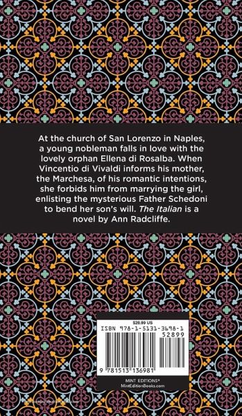 The Italian (1797) is a novel by Ann Radcliffe. Radcliffe's final novel is a tragic story of romance and mystery set in Naples during the brutal years of the Holy Inquisition. Published in the aftermath of the French Revolution, the novel investigates the issues of religion and class that had inspired the Republican cause, changing Europe and the world forever. Considered an essential work of Gothic fiction, The Italian is an early example of her prowess as a leading novelist of suspense and the supernatural. A young Englishman meets a friar while touring Naples. At the church of Santa Maria del Pianto, he notices a shadowy stranger sitting near the confessional. When the friar informs him that the man is an assassin, his friend, an Italian, offers to send him the narrative containing the man's shocking confession. Back at his hotel room, he reads a story beginning in 1758 at the church of San Lorenzo, where a young nobleman falls in love with a beautiful orphan named Ellena. When Vicentio informs his mother, the Marchesa, of his desire to marry the girl, she conspires with the wicked Father Schedoni to change her son's mind. Soon, Ellena disappears, sending Vicentio di Vivaldi on a quest to save her life. This edition of Ann Radcliffe's The Italian is a classic of English literature reimagined for modern readers. Since our inception in 2020, Mint Editions has kept sustainability and innovation at the forefront of our mission. Each and every Mint Edition title gets a fresh, professionally typeset manuscript and a dazzling new cover, all while maintaining the integrity of the original book. With thousands of titles in our collection, we aim to spotlight diverse public domain works to help them find modern audiences. Mint Editions celebrates a breadth of literary works, curated from both canonical and overlooked classics from writers around the globe.