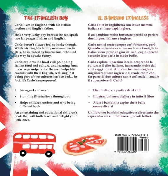 Carlo is bilingual, so what could go wrong? He visits Italy every year, spends quality time with his grandparents and plays all day with his friends in a small seaside town. What does he do when the kids tease him for sounding funny and eating different types of food? Will he have the courage to stick up for himself? Come join Carlo on his journey to confidence and becoming proud of his dual heritage. Written in both English and Italian for ages 4 - 8. Ideal for bilingual children who feel they can identify with dual heritage. Also for helping monolingual children to better understand different cultures and the importance of kindness. Carlo è un bambino bilingue, quindi cosa potrebbe andare storto? Visita l'Italia ogni anno, trascorre del tempo con i nonni e gioca tutto il giorno con i suoi amici in una piccola città marittima. Cosa farà quando i bambini lo prenderanno in giro perché parla in modo strano e mangia cibi diversi? Avrà il coraggio di farsi valere? Unitevi a Carlo nel suo viaggio alla conquista della fiducia in se stesso e dell'orgoglio per la sua doppia eredità. Scritto in inglese e in italiano per bambini e bambine tra i 4 e gli 8 anni. Perfetto per i bambini bilingui che sentono di potersi riconoscere nella doppia eredità culturale. Adatto anche per aiutare i bambini monolingui a comprendere meglio le diverse culture e l'importanza della gentilezza.