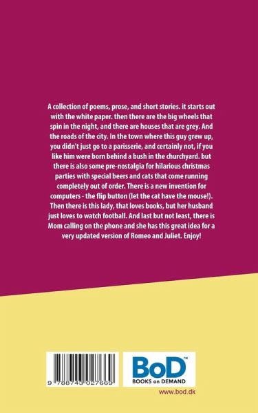 A collection of poems, prose, and short stories. it starts out with the white paper. Then there are the big wheels that spin in the night, and there are houses that are grey. And the roads of the city. In the town where this guy grew up, you didn't just go to a parisserie, and certainly not, if you like him were born behind a bush in the churchyard. but there is also some pre-nostalgia for hilarious christmas parties with special beers and cats that come running completely out of order. There is a new invention for computers - the flip button (let the cat have the mouse!). Then there is this lady, that loves books, but her husband just loves to watch football. And last but not least, there is Mom calling on the phone and she has this great idea for a very updated version of Romeo and Juliet. Enjoy!