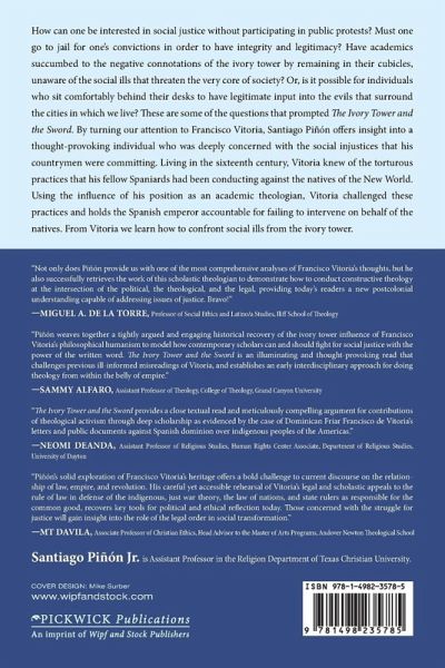 How can one be interested in social justice without participating in public protests? Must one go to jail for one's convictions in order to have integrity and legitimacy? Have academics succumbed to the negative connotations of the ivory tower by remaining in their cubicles, unaware of the social ills that threaten the very core of society? Or, is it possible for individuals who sit comfortably at their desks to have legitimate input into the evils that surround the cities in which we live? These are some of the questions that prompted The Ivory Tower and the Sword. By turning our attention to Francisco Vitoria, Santiago Pinon offers insight into a thought-provoking individual who was deeply concerned with the social injustices that his countrymen were committing. Living in the sixteenth century, Vitoria knew of the torturous practices that his fellow Spaniards had been conducting against the native peoples of the New World. Using the influence of his position as an academic theologian, Vitoria challenged these practices and held the Spanish emperor accountable for failing to intervene on behalf of the native peoples. From Vitoria we learn how to confront social ills from the ivory tower.