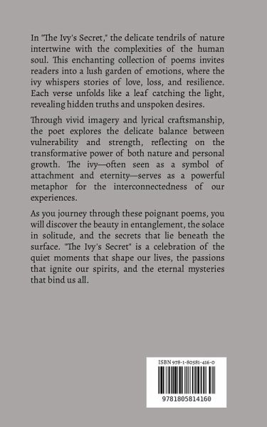 In "The Ivy's Secret," the delicate tendrils of nature intertwine with the complexities of the human soul. This enchanting collection of poems invites readers into a lush garden of emotions, where the ivy whispers stories of love, loss, and resilience. Each verse unfolds like a leaf catching the light, revealing hidden truths and unspoken desires. Through vivid imagery and lyrical craftsmanship, the poet explores the delicate balance between vulnerability and strength, reflecting on the transformative power of both nature and personal growth. The ivy-often seen as a symbol of attachment and eternity-serves as a powerful metaphor for the interconnectedness of our experiences. As you journey through these poignant poems, you will discover the beauty in entanglement, the solace in solitude, and the secrets that lie beneath the surface. "The Ivy's Secret" is a celebration of the quiet moments that shape our lives, the passions that ignite our spirits, and the eternal mysteries that bind us all.