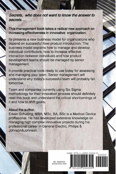 Effective true innovation is key for companies depending on new product introductions. Hundreds of book have been written on the topic how to make these organization effective and controlable. This book takes a radical different approach on the topic and shows with a bottom up approach true new insides, ready to use tomorrow in your practice. It explains why some teams are effective and other teams, taking the same approach, will fail by definition. If you are ready for a step change in your current experience and want to know how to evaluate team competence vs. individual competence, setup an effetive team, how to to train them and to manage them you have the rigth book in your hand to read!