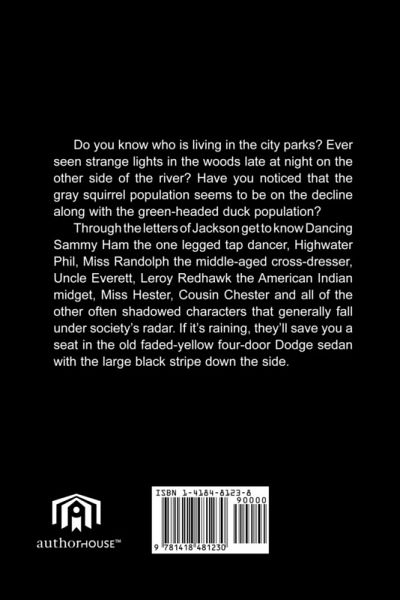 Do you know who is living in the city parks? Ever seen strange lights in the woods late at night on the other side of the river? Have you noticed that the gray squirrel population seems to be on the decline along with the green-headed duck population? Through the letters of Jackson get to know Dancing Sammy Ham the one legged tap dancer, Highwater Phil, Miss Randolph the middle-aged cross-dresser, Uncle Everett, Leroy Redhawk the American Indian midget, Miss Hester, Cousin Chester and all of the other often shadowed characters that generally fall under society's radar. If it's raining, they'll save you a seat in the old faded-yellow four-door Dodge sedan with the large black stripe down the side.