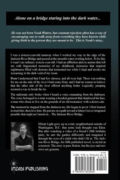 Alone on a bridge staring into the dark water... He was not born Noah Waters, but constant rejection often has a way of encouraging one to walk away from everything they have known while giving birth to the person they are meant to be. This is Noah's story... I was a sixteen-year-old runaway when I worked my way to the edge of the Jackson River Bridge and peered at the moonlit water swirling below. To be fair, I wasn't an ordinary sixteen-year-old. I had an affliction akin to autism that left me with fragmented memories of my childhood, memories that inspired nightmares filled with demons that tormented me while I slept and awoke me screaming in the dark void of my room. Even I understood that I had few choices, and all were bad. There was nothing for me on the side of the river I had come from, and I had no reason to believe that the other side of the river offered anything better. Logically, jumping seemed a way to break the tie. The stalemate only broke when I heard a voice emanating from the darkness. The voice belonged to a man wearing a hooded garment that shadowed his face, a man who chose to live on the grounds of an old monastery with a dozen cats. The moment he stepped from the darkness my life began to pivot. I first learned to trust him, then love him. He put me on a path toward a future I never imagined possible that night as I stood on...The Jackson River Bridge.