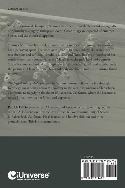 Sired by a national champion, Summer Storm's birth in the beautiful rolling hills of Kentucky is a highly anticipated event. Great things are expected of Summer Storm, and she doesn't disappoint. Summer Storm-a beautiful, innocent, and carefree championship racehorse-has a persistent spirit. The word quit is not in her vocabulary. She wins every race she runs and achieves incredible success and fame. But the innocence of her youth is eventually consumed as the Mafia's tentacles grab hold and Summer Storm becomes embroiled in a doping scandal. Betrayal, greed, and murder enter the picture and leave her once-beautiful body and home and her promising future in peril. The Jagged Side of Midnight, told by Summer Storm, follows her life through Kentucky, meandering across the country to the scenic mountains of Tehachapi, California, to tragedy in the desert of Lancaster, California, where she becomes a rescue horse-leaving her lonely and depressed.