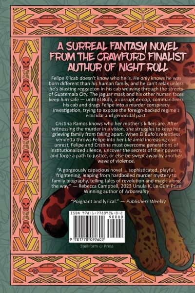 Felipe K'icab doesn't know who he is. He only knows he was born different than his human family, and he can't relax unless he's blasting reggaeton in his cab weaving through the streets of Guatemala City. The jaguar mask and his other human faces keep him safe--until El Bufo, a corrupt ex-cop, commandeers his cab and drags Felipe into a murder conspiracy investigation, trying to expose the foreign-backed regime's ecocidal and genocidal past. Cristina Ramos knows who her mother's killers are. After witnessing the murder in a vision, she struggles to keep her grieving family from falling apart. When El Bufo's relentless vendetta throws Felipe into her life amid increasing civil unrest, Felipe and Cristina must overcome generations of institutionalized silence, uncover the secrets of their powers, and forge a path to justice, or else be swept away by another wave of violence.