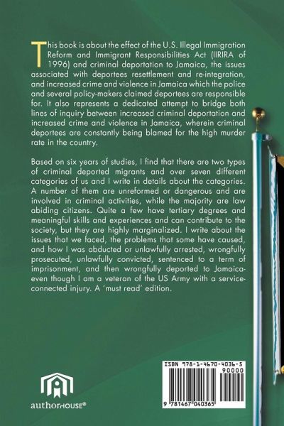 This book is about the effect of U.S. Illegal Immigration Reform and Immigrant Responsibilities Act (IIRIRA of 1996) and criminal deportation to Jamaica, the issues associated with deportees resettlement and re-integration, and increased crime and violence in Jamaica which the police and several policy-makers claimed deportees are responsible for. It also represents a dedicated attempt to bridge both lines of inquiry between increased criminal deportation and increased crime and violence in Jamaica, wherein criminal deportees are constantly being blamed for the high murder rate in the country. Based on six years of studies, I find that there are two types of criminal deported migrants and over seven different categories of us and I write in details about the categories. A number of them are unreformed or dangerous and are involved in criminal activities, while the majority are law abiding citizens. Quite a few have tertiary degrees and meaningful skills and experiences and can contribute to the society, but they are highly marginalized. I write about the issues that we faced, the problems that some have caused, and how I was abducted or unlawfully arrested, wrongfully prosecuted, unlawfully convicted, sentenced to a term of imprisonment, and then wrongfully deported to Jamaica-even though I am a veteran of the US Army with a service-connected injury. A 'must read' edition.
