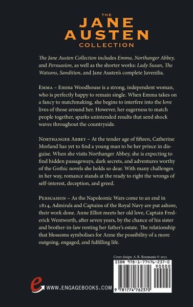 The Jane Austen Collection includes Emma, Northanger Abbey, and Persuasion, as well as the shorter works; Lady Susan, The Watsons, Sandition, and Jane Austen's complete Juvenilia. Emma - Emma Woodhouse is a strong, independent woman, who is perfectly happy to remain single. When Emma takes on a fancy to matchmaking, she begins to interfere into the love lives of those around her. However, her eagerness to match people together, sparks unintended results that send shock waves throughout the countryside. Northanger Abbey - At the tender age of fifteen, Catherine Morland has yet to find a young man to be her prince in disguise. When she visits Northanger Abbey, she is expecting to find hidden passageways, dark secrets, and adventures worthy of the Gothic novels she holds so dear. With many challenges in her way, romance stands at the ready to right the wrongs of self-interest, deception, and greed. Persuasion - As the Napoleonic Wars come to an end in 1814, Admirals and Captains of the Royal Navy are put ashore, their work done. Anne Elliot meets her old love, Captain Frederick Wentworth, after seven years, by the chance of his sister and brother-in-law renting her father's estate. The relationship that blossoms symbolises for Anne the possibility of a more outgoing, engaged, and fulfilling life.