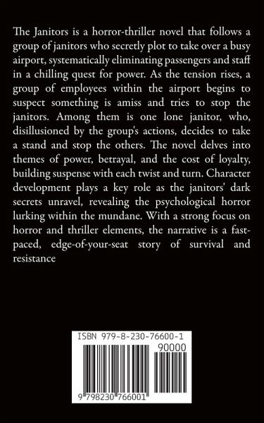 The Janitors is a horror-thriller novel that follows a group of janitors who secretly plot to take over a busy airport, systematically eliminating passengers and staff in a chilling quest for power. As the tension rises, a group of employees within the airport begins to suspect something is amiss and tries to stop the janitors. Among them is one lone janitor, who, disillusioned by the group's actions, decides to take a stand and stop the others. The novel delves into themes of power, betrayal, and the cost of loyalty, building suspense with each twist and turn. Character development plays a key role as the janitors' dark secrets unravel, revealing the psychological horror lurking within the mundane. With a strong focus on horror and thriller elements, the narrative is a fast-paced, edge-of-your-seat story of survival and resistance