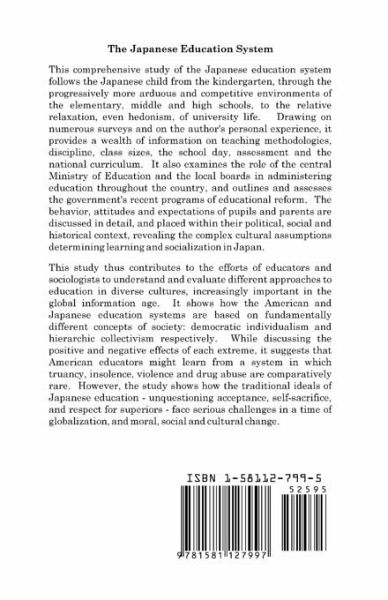 This comprehensive study of the Japanese education system follows the Japanese child from the kindergarten, through the progressively more arduous and competitive environments of the elementary, middle and high schools, to the relative relaxation, even hedonism, of university life. Drawing on numerous surveys and on the author's personal experience, it provides a wealth of information on teaching methodologies, discipline, class sizes, the school day, assessment and the national curriculum. It also examines the role of the central Ministry of Education and the local boards in administering education throughout the country, and outlines and assesses the government's recent programs of educational reform. The behavior, attitudes and expectations of pupils and parents are discussed in detail, and placed within their political, social and historical context, revealing the complex cultural assumptions determining learning and socialization in Japan. This study thus contributes to the efforts of educators and sociologists to understand and evaluate different approaches to education in diverse cultures, increasingly important in the global information age. It shows how the American and Japanese education systems are based on fundamentally different concepts of society: democratic individualism and hierarchic collectivism respectively. While discussing the positive and negative effects of each extreme, it suggests that American educators might learn from a system in which truancy, insolence, violence and drug abuse are comparatively rare. However, the study shows how the traditional ideals of Japanese education - unquestioning acceptance, self-sacrifice, and respect for superiors - face serious challenges in a time of globalization, and moral, social and cultural change.
