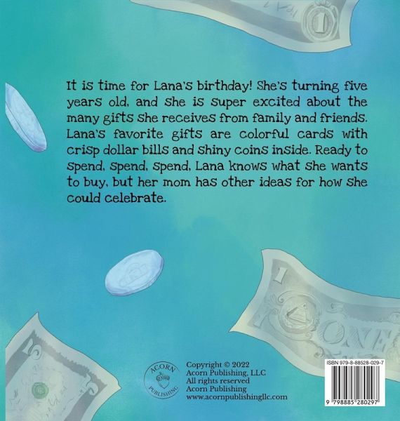 ¿It is time for Lana's birthday! She's turning five years old, and she is super excited about the many gifts she received from family and friends. Lana's favorite gifts are colorful cards with crisp dollar bills and shiny coins inside. Ready to spend, spend, spend, Lana knows what she wants to buy, but her mom has other ideas for how she could celebrate.