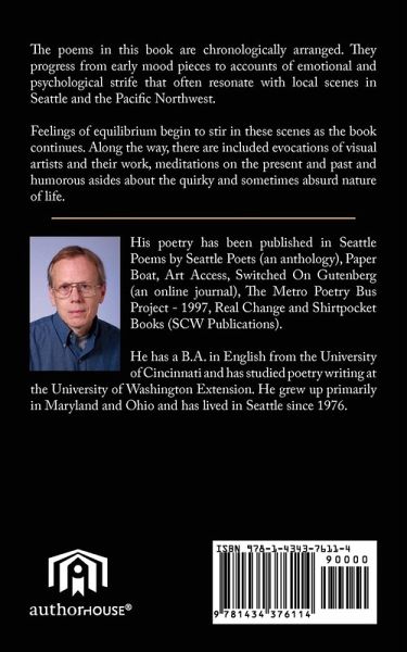 The poems in this book are chronologically arranged. They progress from early mood pieces to accounts of emotional and psychological strife that often resonate with local scenes in Seattle and the Pacific Northwest. Feelings of equilibrium begin to stir in these scenes as the book continues. Along the way, there are included evocations of visual artists and their work, meditations on the present and past and humorous asides about the quirky and sometimes absurd nature of life.
