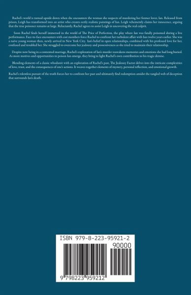 Rachel's world is turned upside down when she encounters the woman she suspects of murdering her former lover, Ian. Released from prison, Leigh has transformed into an artist who creates eerily realistic paintings of Ian. Leigh vehemently claims her innocence, arguing that the true poisoner remains at large. Reluctantly, Rachel agrees to assist Leigh in uncovering the real culprit. Soon Rachel finds herself immersed in the world of The Price of Perfection, the play where Ian was fatally poisoned during a live performance. Face-to-face encounters with cast members force Rachel to confront her turbulent affair with Ian twelve years earlier. She was a naïve young woman then, newly arrived in New York City. Ian's belief in open relationships, combined with his professed love for her, confused and troubled her. She struggled to overcome her jealousy and possessiveness as she tried to maintain their relationship. Despite now being in a contented marriage, Rachel's exploration of Ian's murder reawakens memories and emotions she had long buried. As more motives and opportunities to poison Ian emerge, they bring to light Rachel's own contribution to his tragic demise. Blending elements of a classic whodunit with an exploration of Rachel's past, The Jealousy Factor delves into the intricate complexities of love, trust, and the consequences of one's actions. It weaves together elements of mystery, personal reflection, and emotional growth. Rachel's relentless pursuit of the truth forces her to confront her past and ultimately find redemption amidst the tangled web of deception that surrounds Ian's death.