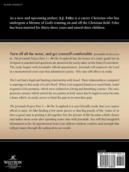 Turn off all the noise, and get yourself comfortable. Jeremiah invites you in. The Jeremiah Project Part 1-The Scrapbook has the bones of a study guide but as Scripture is searched and questions are answered the study takes on the form of a novelette. The study begins with Jeremiah's official appointment. Jeremiah will represent the Lord in a monumental court case that administers justice. This case still affects us today. The Lord had a legal and binding relationship with Israel. Their relationship is compared to marriage in this study of God's Word. When God acquired Israel as a vessel-bride, Israel acquired God's promises, which were outlined in a living and breathing contract. The once gracious contract which united the two parties in holy union has by legal recourse become a beast which, in study, serves to bind the pair in its merciless grip. The Jeremiah Project Part 1-The Scrapbook is a user-friendly study that you cannot afford to miss. It's like finding a few more pieces to that big puzzle of life. Some of us have a good start at putting it all together, but the picture of life becomes a little clearer and makes more sense after spending some time with Jeremiah. You will find insightful information as he, by appointment from God, delivers wisdom, comfort, and strength that will get many through the upheaval in our world.