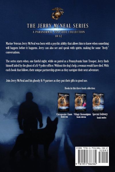 The Jerry McNeal Series, a Paranormal Snapshot Collection Volume 4 Marine Veteran Jerry McNeal was born with a psychic ability that allows him to know when something will happen before it happens. Jerry can also see and speak with spirits, making for some "lively" conversations. The series starts when, one fateful night, while on patrol as a Pennsylvania State Trooper, Jerry finds himself aided by the ghost of a K-9 police officer. Without the dog's help, a woman would have died. With each book that follows, their unique partnership grows as they navigate their next adventure. Join Jerry McNeal and his ghostly K-9 partner as they put their gifts to good use. Books in this three-book collection: Chesapeake Chaos - book ten Village Shenanigans - book eleven Special Delivery - book twelve