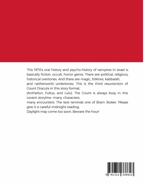 This 1970's oral history and psycho-history of vampires in Israel is basically fiction, occult, horror genre. There are political, religious, historical overtones. And there are magic, folklore, kabbalah, and netherworld undertones. This is the third resurrection of Count Dracula in this story format (Anthelion, Fultus, and Lulu). The Count is always busy in this Levant storyline--many characters, many encounters. The text reminds one of Bram Stoker. Please give it a careful midnight reading. Daylight may come too soon. Beware the hour!