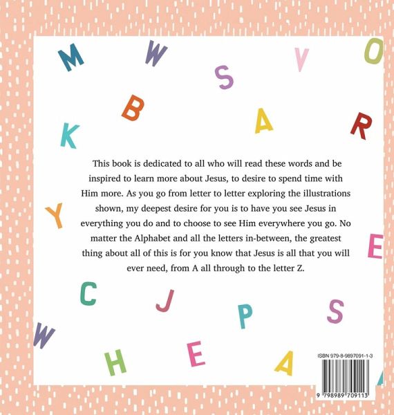 "The Jesus Alphabet" is a picture book that is a rendition of what we have come to know as the essentials letters of the English language. In this book, "The Jesus Alphabet" is a Christian take on every letter of the Alphabet showcasing the many Characteristics and truths about our Lord and Savior, Jesus Christ. As each reader goes from letter to letter exploring the illustrations shown, my deepest desire is to inspire everyone to see Jesus in everything they do and choose to see Him everywhere they go. No matter the Alphabet and all the letters in-between, the greatest thing about all of this is for every reader to know that Jesus is all that you will ever need, from A all the through to the letter Z. Revelations 21:6 ERV Translation The one on the throne said to me, "It is finished! I am the Alpha and the Omega, the Beginning and the End. I will give free water from the spring of the water of life to anyone who is thirsty.