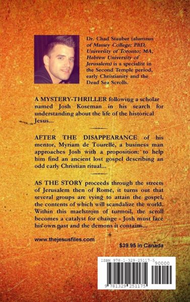A MYSTERY-THRILLER following a scholar named Josh Koseman in his search for understanding about the life of the historical Jesus... AFTER THE DISAPPEARANCE of his mentor, Myriam de Tourelle, a business man approaches Josh with a proposition: to help him find an ancient lost gospel describing an odd early Christian ritual... AS THE STORY proceeds through the streets of Jerusalem then of Rome, it turns out that several groups are vying to attain the gospel, the contents of which will scandalize the world. Within this maelstrom of turmoil, the scroll becomes a catalyst for change - Josh must face his own past and the demons it contains... --- Dr. Chad Stauber (alumnus of Massey College; PhD, University of Toronto; MA, Hebrew University of Jerusalem) is a specialist in the Second Temple period, early Christianity and the Dead Sea Scrolls.
