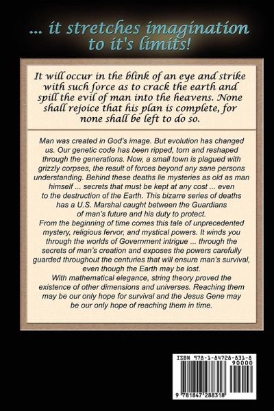 Man was created in God's image. But evolution has changed us. Our genetic code has been ripped, torn and reshaped through the generations. Now, a small town is plagued with grizzly corpses, the result of forces beyond any sane persons understanding. Behind these deaths lie mysteries as old as man himself ... secrets that must be kept at any cost. This bizarre series of deaths has a U.S. Marshal caught between the Guardians of man's future and his duty to protect. From the beginning of time comes this tale of unprecedented mystery, religious fervor, and mystical powers. It winds you through the worlds of Government intrigue ... through the secrets of man's creation and exposes powers carefully guarded throughout the centuries that will ensure man's survival. String theory proved the existence of other dimensions and universes. Reaching them may be our only hope for survival and genetic code carried by descendents of Jesus and Mary Magdalene may be our only hope of reaching them in time.