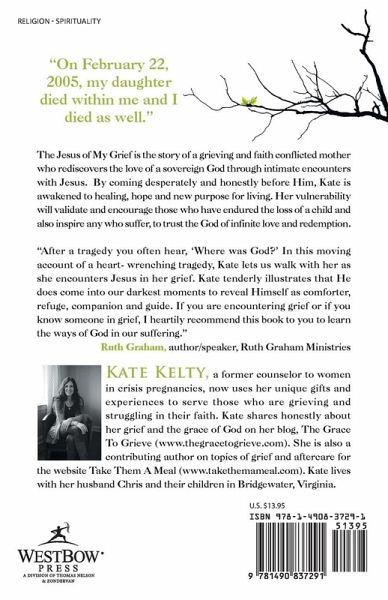 On February 22, 2005 my daughter died within me and I died as well. This is the story of my resurrection. The Jesus of My Grief is the story of a grieving and faith conflicted mother who rediscovers the love of a sovereign God through intimate encounters with Jesus. By coming desperately and honestly before Him, Kate is awakened to healing, hope and new purpose for living. Her vulnerability will validate and encourage those who have endured the loss of a child and also inspire any who suffer, to trust the God of infinite love and redemption. "After a tragedy you often hear, 'Where was God?' In this moving account of a heart- wrenching tragedy, Kate lets us walk with her as she encounters Jesus in her grief. Kate tenderly illustrates that He does come into our darkest moments to reveal Himself as comforter, refuge, companion and guide. If you are encountering grief or if you know someone in grief, I heartily recommend this book to you to learn the ways of God in our suffering." Ruth Graham, author/speaker, Ruth Graham Ministries